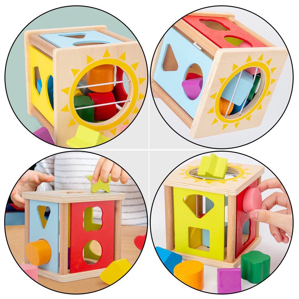 Transformă joaca într-o aventură de învățare! Acest cub multisenzorial din lemn este mai mult decât o simplă jucărie; este un instrument de dezvoltare timpurie care îi ajută pe micuți să exploreze lumea geometriei și a culorilor într-un mod tactil și distractiv.