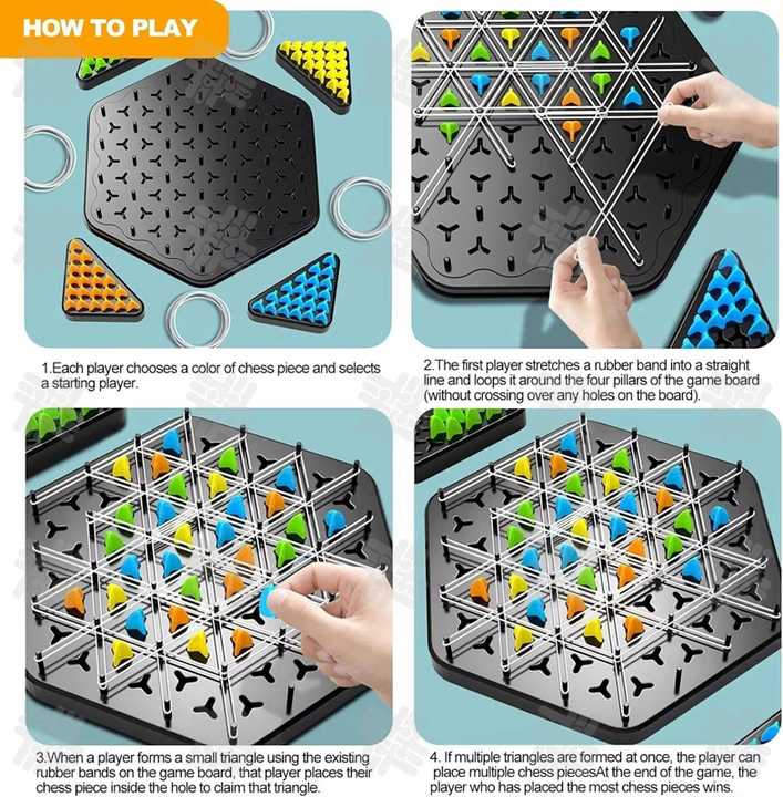 Obiectivul este simplu: folosește benzile elastice pentru a crea cât mai multe triunghiuri pe tabla de joc.
