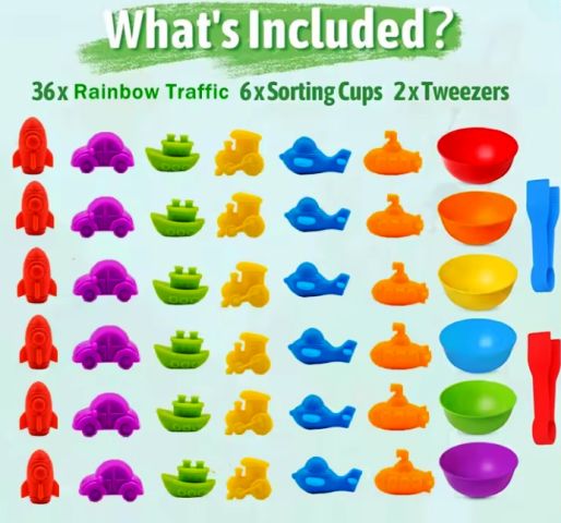 - Clasificare și Sortare: Copiii învață să sorteze piesele după două criterii principale: culoare (punând toate piesele roșii în bolul roșu) și formă (punând toate trenulețele la un loc).