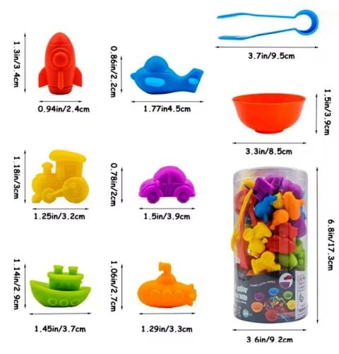 - Coordonarea Mână-Ochi: Copilul trebuie să coordoneze mișcările pentru a prinde piesa și a o plasa cu precizie în bolul corect.