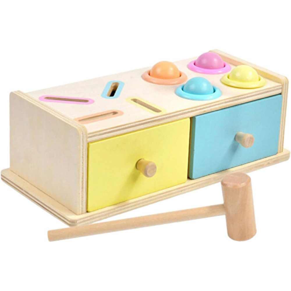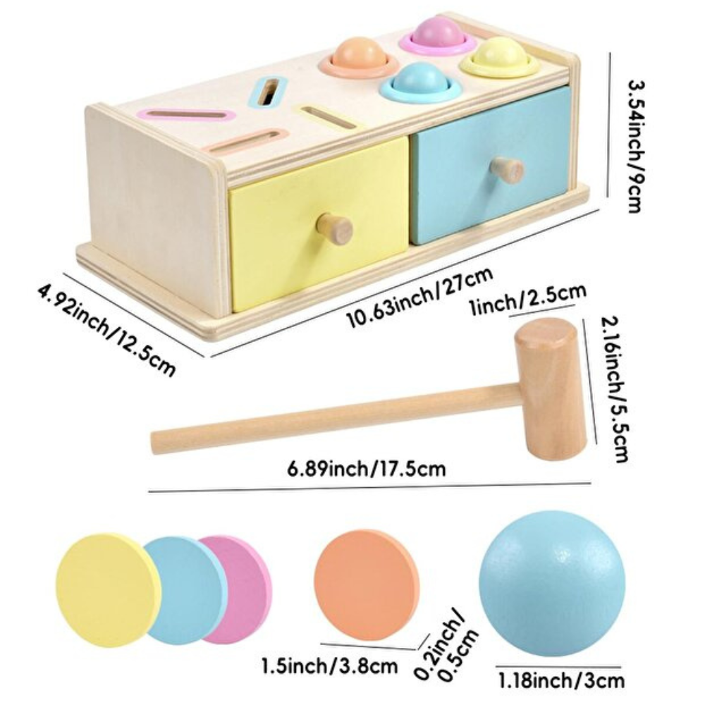 Jucarie pentru baieti si fete, Montessori, Cutia Permanentei cu jetoane, bilute, ciocanel si sertare, din lemn, 3 ani+