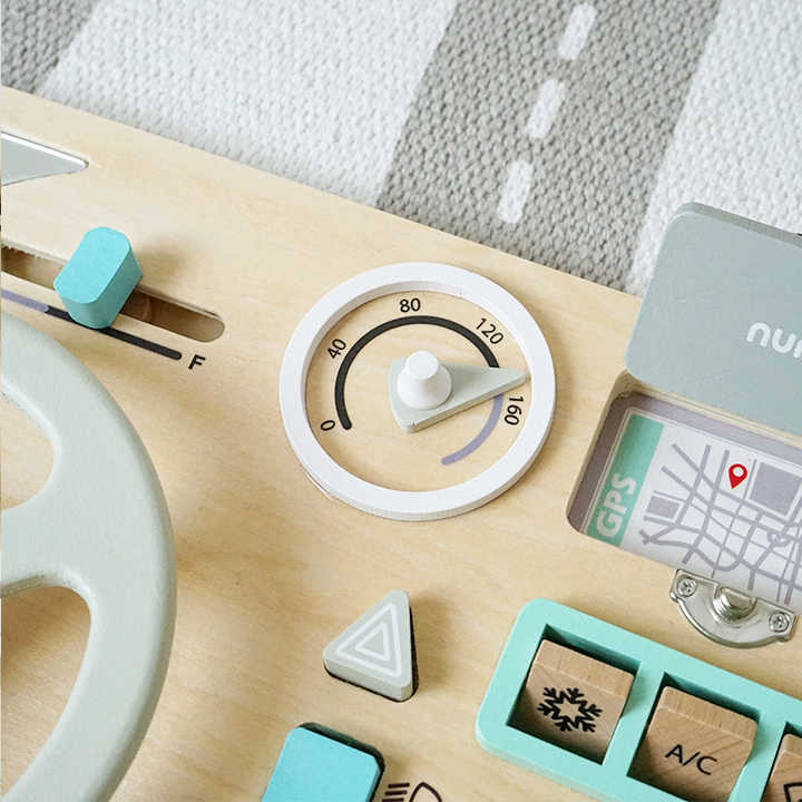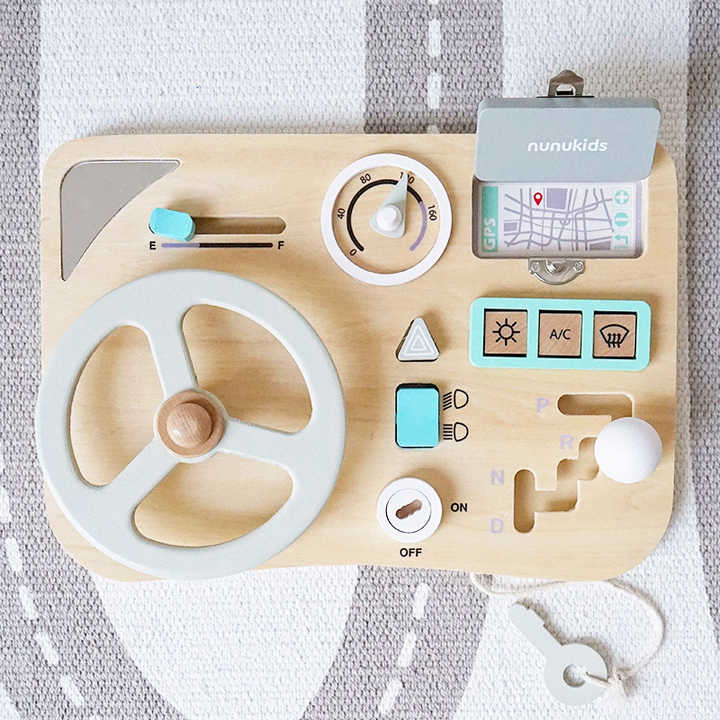 Jucaria este un panou de activitati din lemn, conceput pentru a imita un volan de masina si alte elemente de bord. Este un centru de activitati senzoriale care ofera copiilor oportunitatea de a explora diverse texturi, forme si functii.