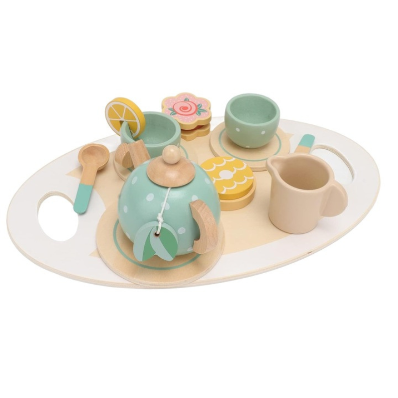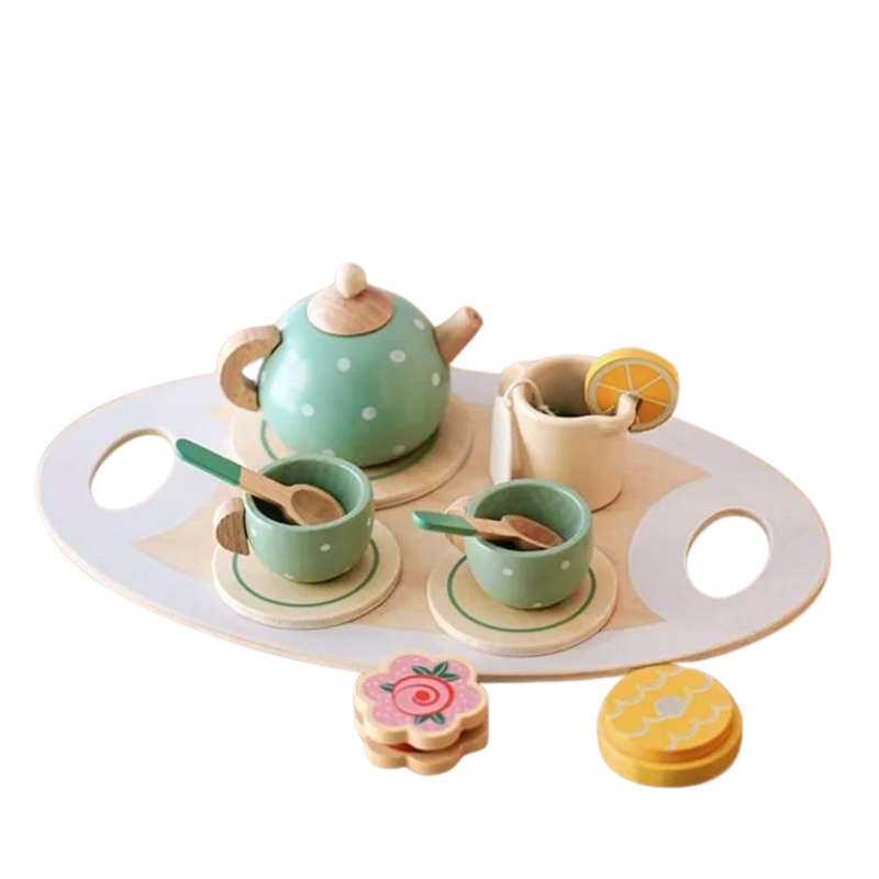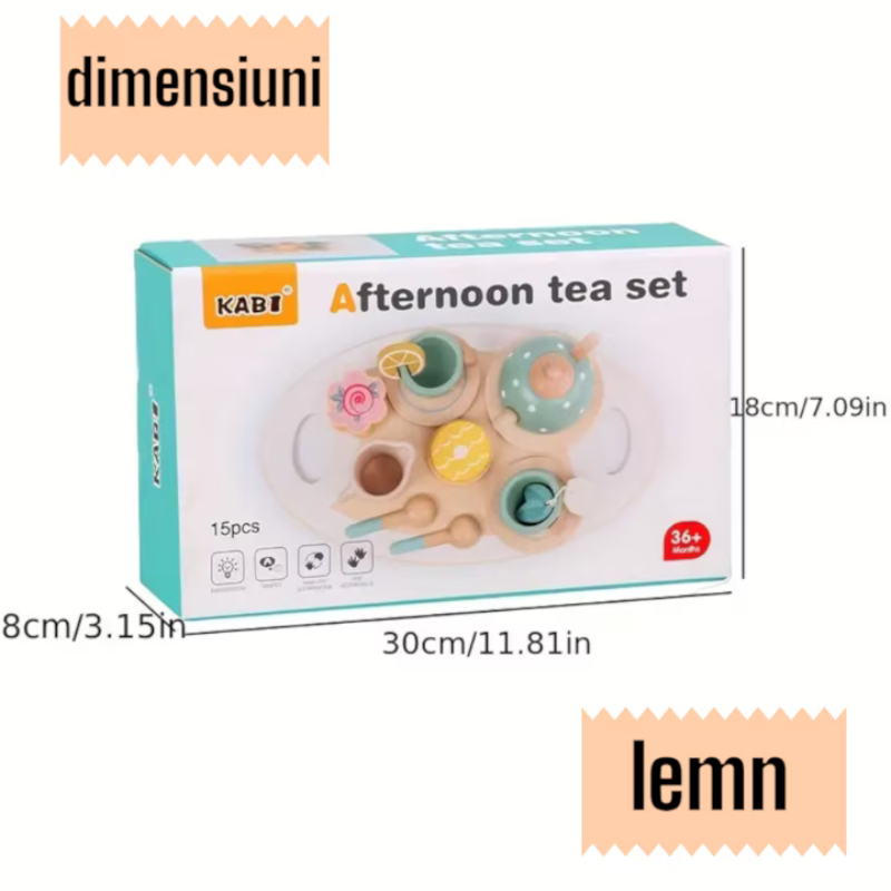 Setul de servit ceaiul Afternoon Tea Kabi este o jucarie educativa si distractiva pentru copii, conceputa pentru a-i ajuta sa invete si sa se joace in acelasi timp. Setul contine o tavita eleganta din lemn, o ceainic, doua cesti de ceai, doua farfurii, doua lingurite si o punguta de ceai.