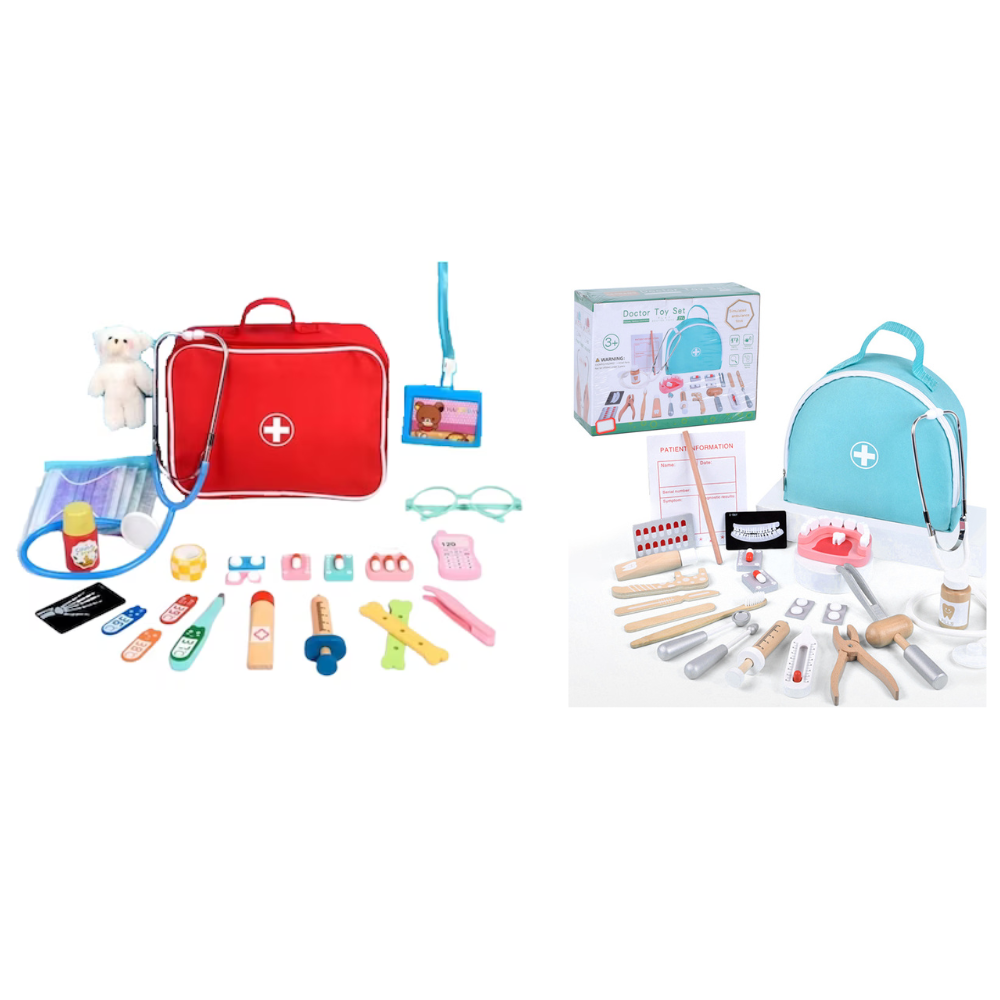 Trusa medicala de jucarie, set cu accesorii din lemn, plastic si metal, jucarie interactiva de rol pentru copii